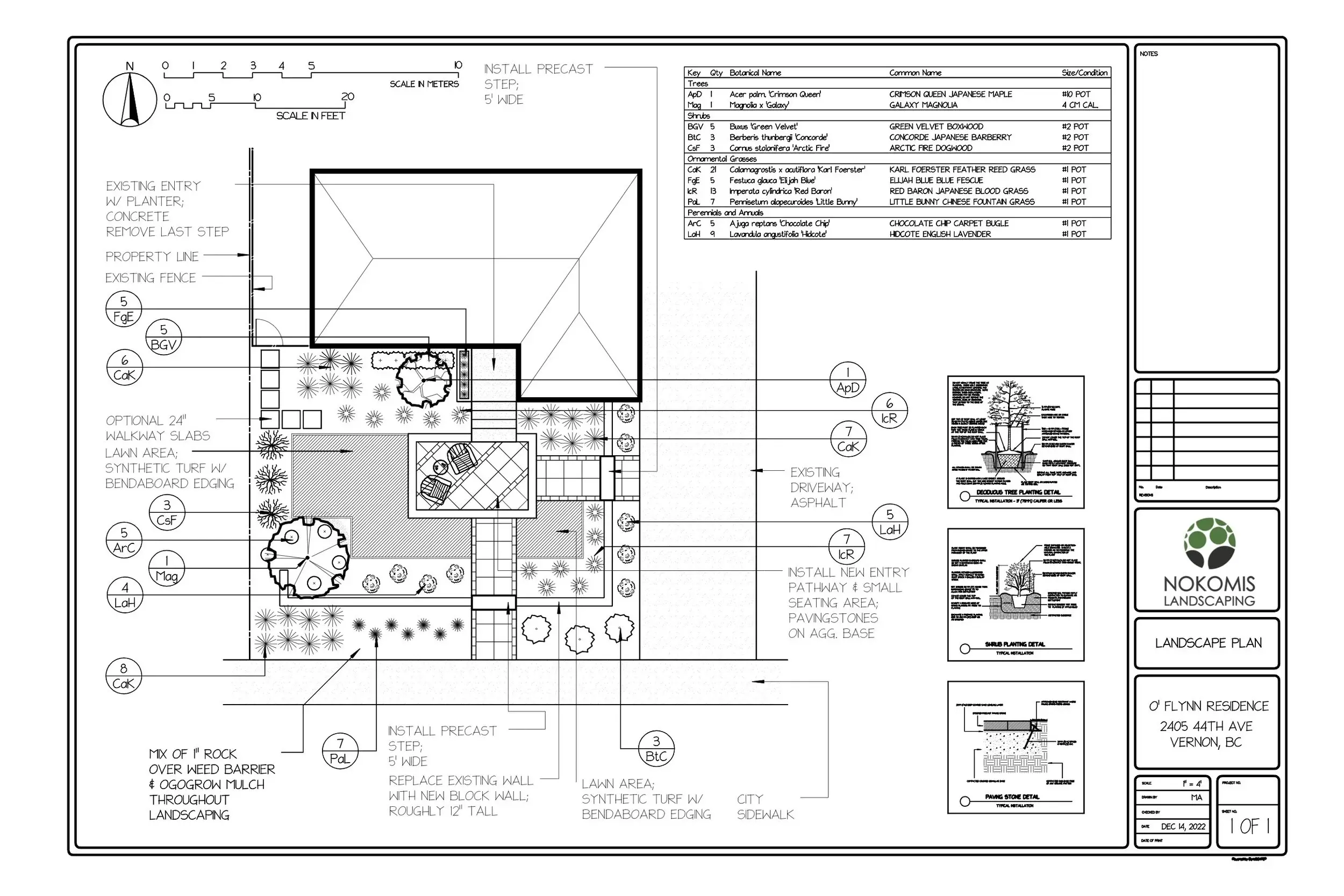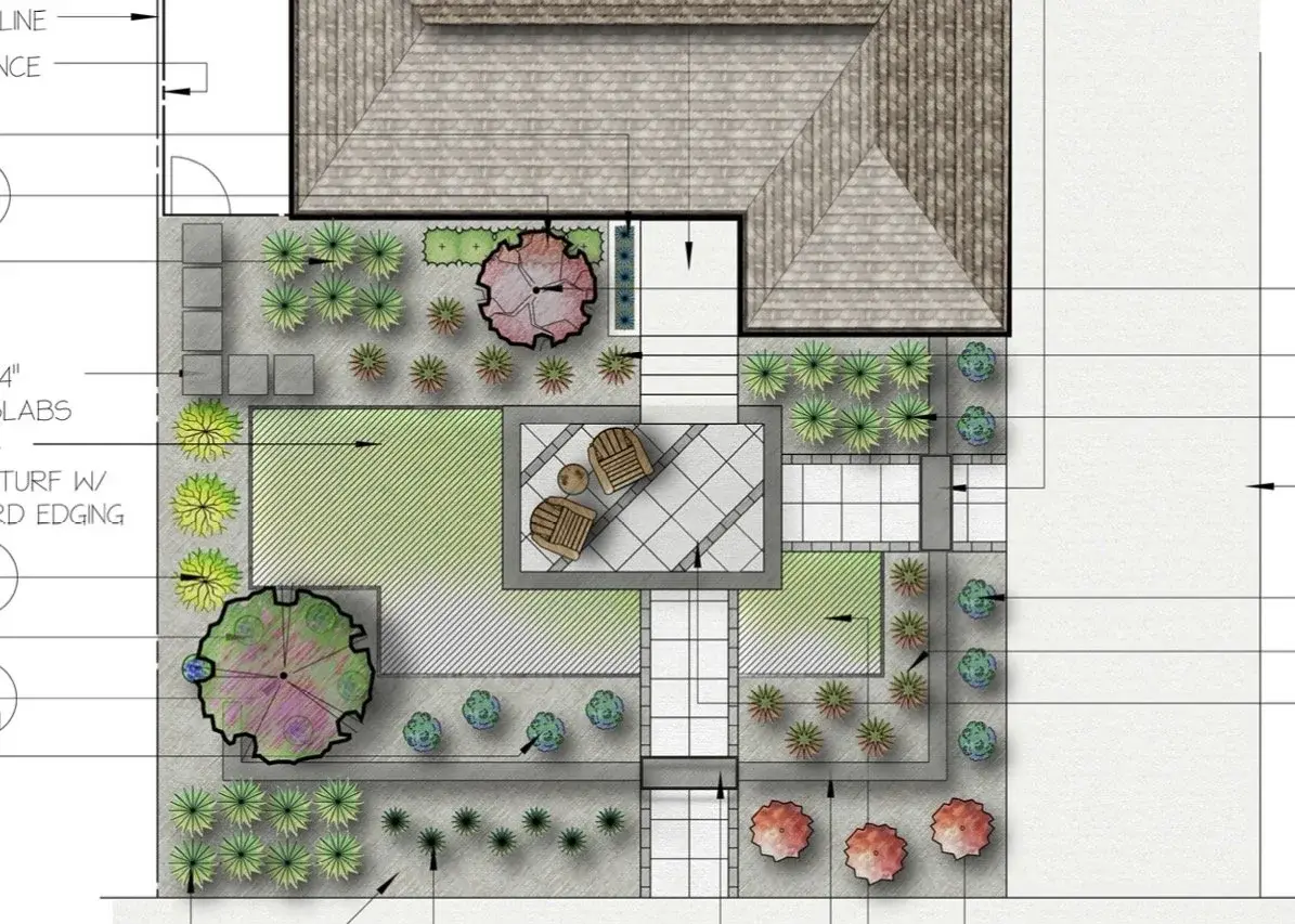 Beyond the hardscapes, simple xeriscaping is in order, featuring some attractive accent trees like magnolia and Japanese maple, and groupings of grasses, lavender and ground covers. Additional irrigaiton and lighting will compliment this attractive front yard.