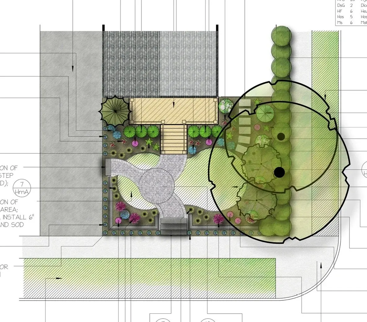 Main focus for us will be the hardscapes here. Replace the wall with a block wall and integrated steps while adding a Roman paver entry way with central intersection for 3 pathways - on meeting the driveway and one meeting the sidewalk. I would still advise greening this front yard up with a lawn area that is curvy similar to the walkway, and add a series of plantings that do well in part-shade while providing some winter interest with boxwoods and a slender evergreen against the house. a couple of Serviceberry tree to add to the understory of the maples and leaving the tidy hedge to delineate the property from the busy sidewalk. A lighting package here would be great to emphasize the hardscapes and show off the large Maples and new plantings.