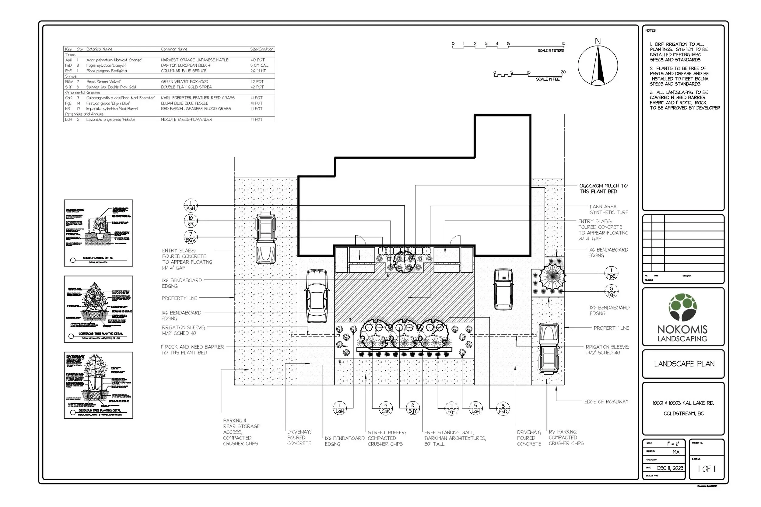 Low maintenance plantings throughout, irrigation, lighting accents on the wall and plant material, and grey crusher chips for all miscellaneous parking spots, roadways and a snow storage area against the roadway.