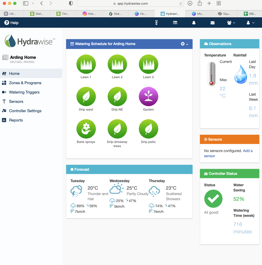 Hydrawise uses the Global Weather Monitoring System, which is the same system the weather networks use, so you can be assured that we have the most up to date information. For example, if heavy rainfall is expected (10mm) your watering could be omitted for the week! The program offers detailed reports showing water savings, potential issues, and schedule changes. These offerings really help us to dial in your specific needs…Saving you time and water